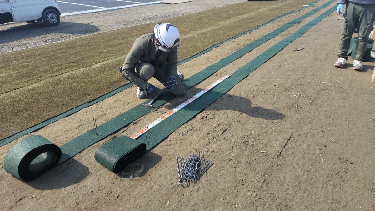 ・植生をスナゴケとすることで、土を使用せずに緑化できる。また、基盤が防草シートのため、緑化しながら防草することができる。 ・基盤の防草シートはスナゴケにより紫外線劣化が生じず長期共用が可能。 |