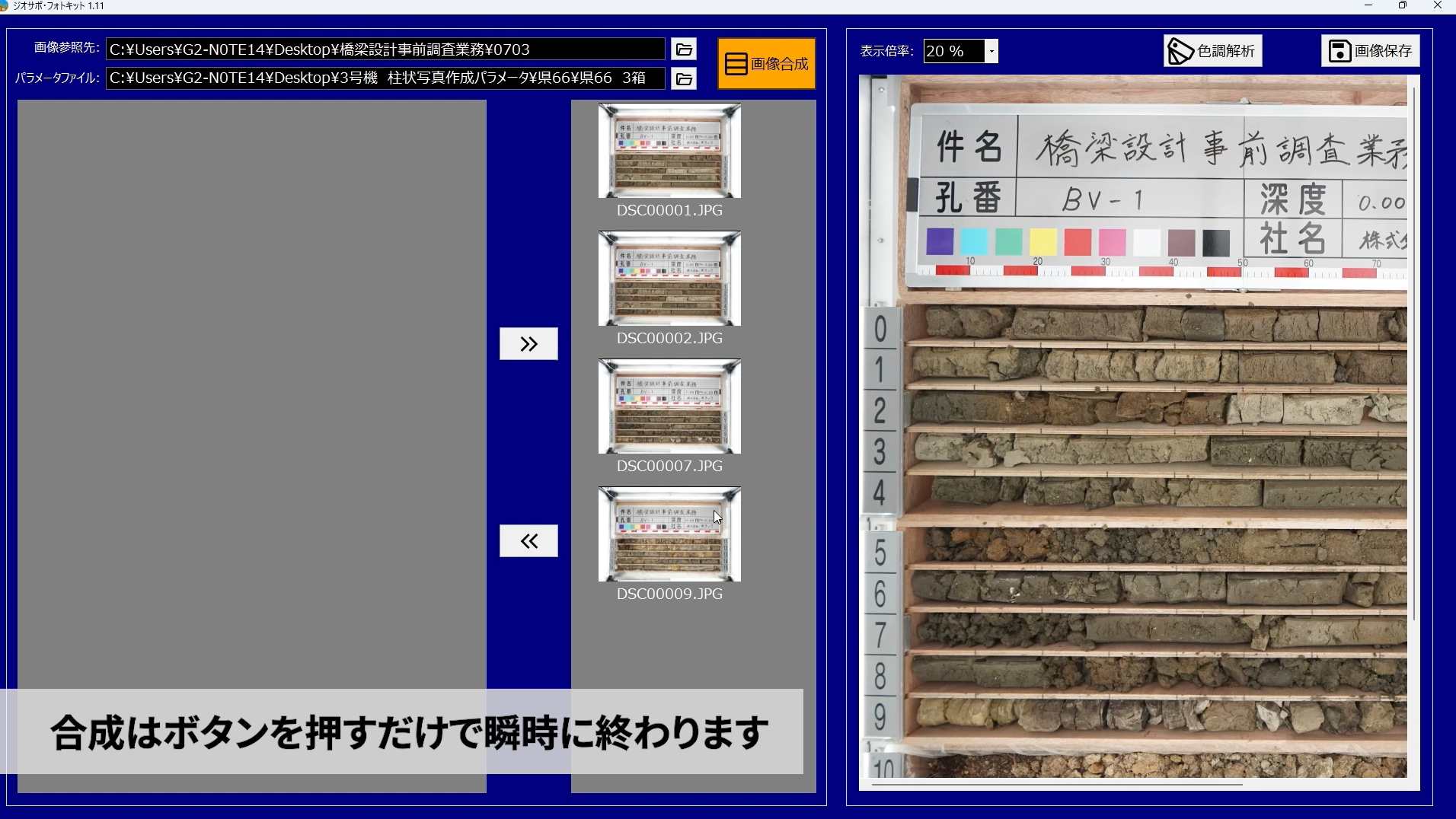 ・撮影環境の標準化により、画像品質のバラツキを抑え、記録精度が向上 ・撮影データの自動合成により、作業効率が向上 ・標準土色帖に基づく色判定を支援するとともに、xmlファイルへの出力が可能 ・車両積載が可能なことから、技術の展開性が高まり、他現場への展開が容易 |