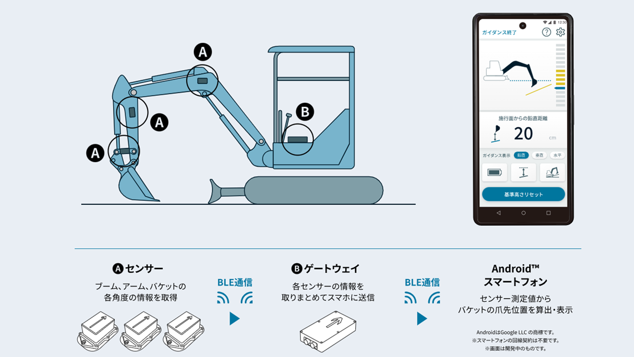 ・バックホウのメーカー問わず後付け可能 ・GPSやインターネット環境不要 ・3D施工データ不要、安価にマシンガイダンス導入可能 ・初期設定はスマートフォンアプリを使って5分程度で完了 |